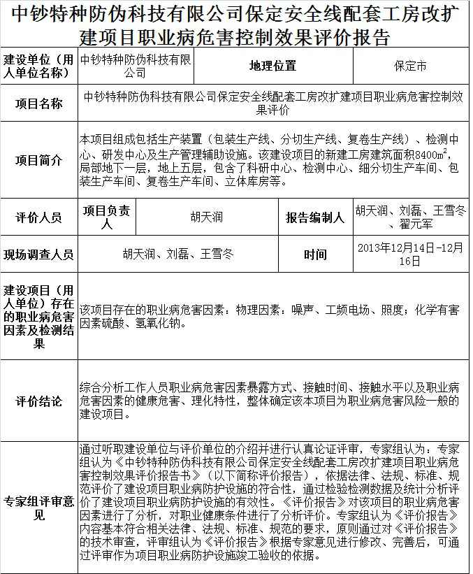 中钞特种防伪科技有限公司保定安全线配套工房改扩建项目职业病危害控制效果评价